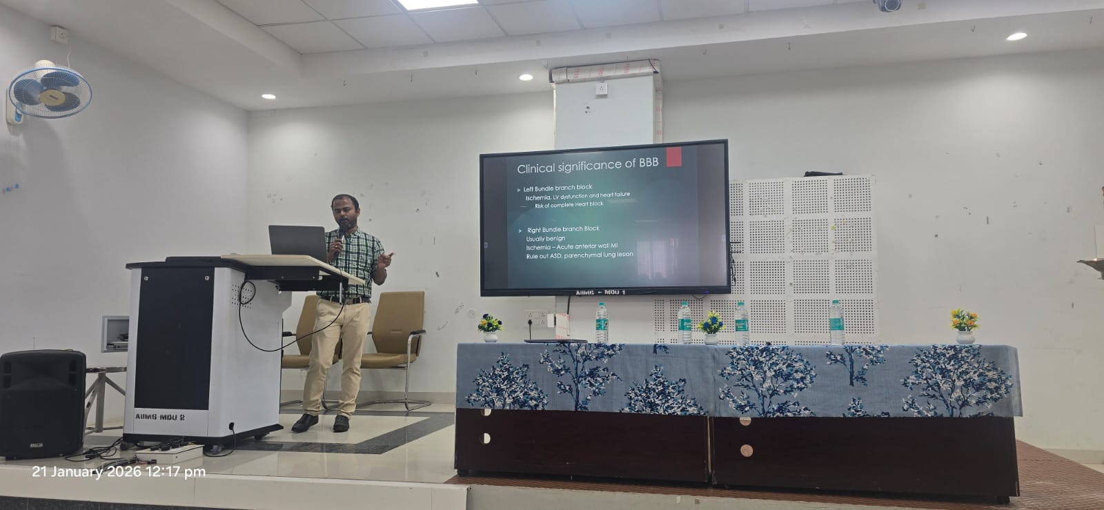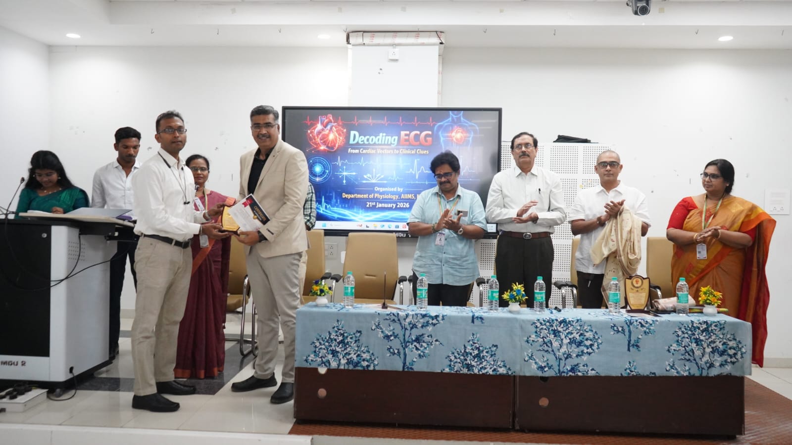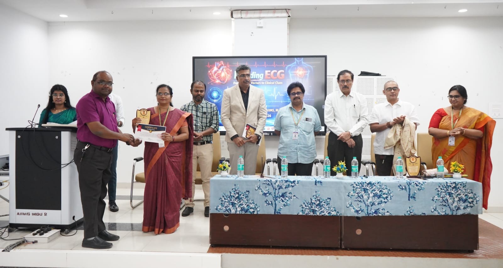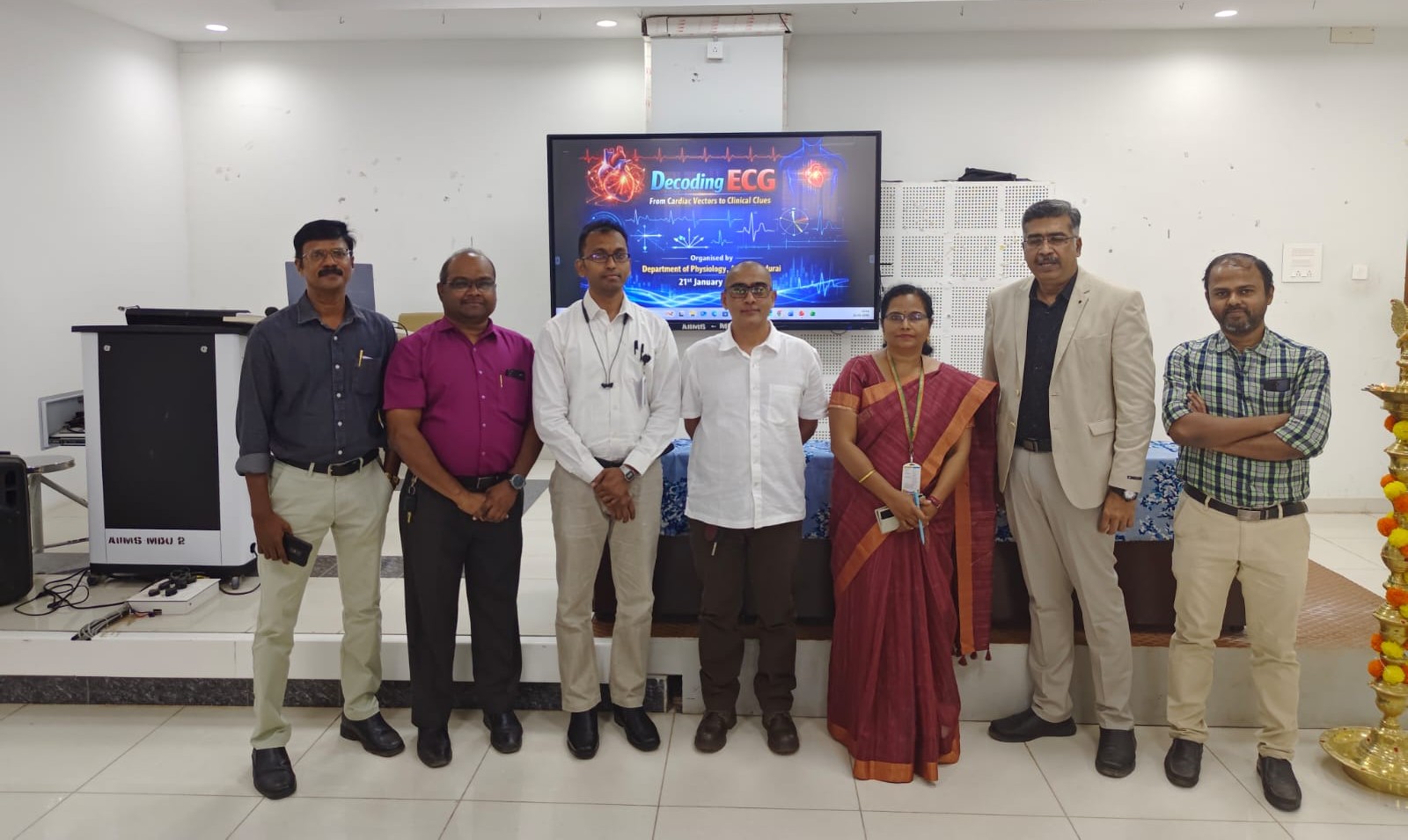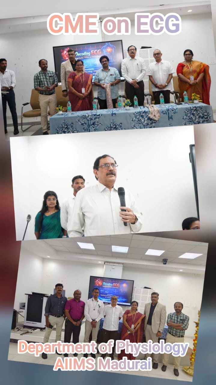 Under the guidance of Honorable President of AIIMS, Madurai Prof Dr Prashant Lavania and Honourable Executive Director and CEO of AIIMS, Madurai Prof Dr Hanumantha Rao, Department of Physiology, AIIMS, Madurai has successfully conducted a CME on ECG titled “Decoding ECG: from Cardiac vectors to Clinical Clues” on 21st January 2026 at Sarvepalli Radhakrishnan Hall, Govt Medical College, Ramanathapuram The program started with a welcome address and opening remarks by Dr Anandhalakshmi, Professor and Head, Department of Physiology, AIIMS, Madurai Executive Director and CEO Prof Dr Hanumantha Rao, Dean-Incharge (Academics and Administration) Dr Ganesh babu and Dean-Incharge Dr Mangayarkarasi graced the occasion Dr Anandhalakshmi, Professor and Head of Physiology, AIIMS, Madurai, Dr P S L Saravanan, Director and Professor, Institute of Physiology, Madurai Medical College, Dr P Shanmuga Sundaram, Director, Department of Cardiology and Cath Lab, VMCHRI, Madurai and Dr P V Balamurugan, Professor, Department of Medicine, Madurai Medical College were the resource persons and gave excellent talks on all the aspects of ECG recording and reading First year MBBS students of AIIMS, Madurai and faculties of AIIMS, Madurai participated and benefitted by the eminent lectures delivered The program concluded with vote of thanks by Dr Senthil Velou, Additional Professor of Physiology, AIIMS, Madurai