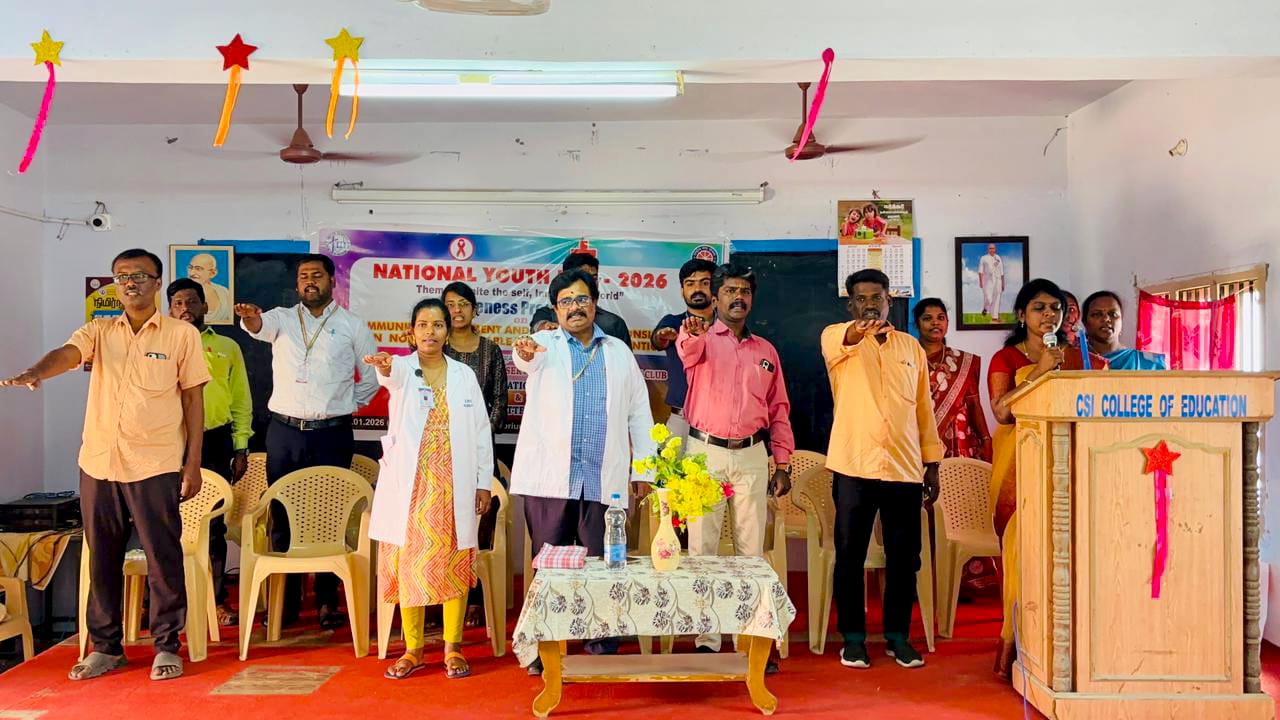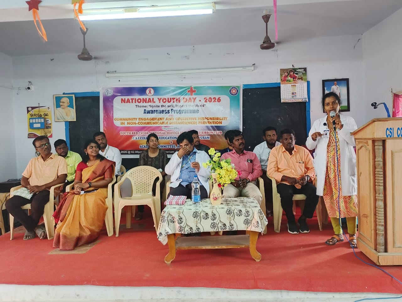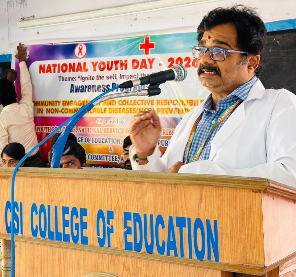 Guided by the Honourable Executive Director, Prof Dr Hanumantha Rao, National Youth Day 2026 was celebrated on 12 January 2026 at CSI College, Ramanathapuram, with the theme “Ignite the Self, Impact the World” The programme was organised by the Academic Committee, AIIMS Madurai, along with Social Outreach Cell The event was graced by the participation of the following faculty members from AIIMS Madurai Dr CP Ganesh Babu, Dean In-charge (Academics & Administration) Dr Sarah R and Dr Prabhakaran N, Assistant Deans (Academics) Academic Committee Members – Dr Arumuganathan S, Dr Sasikala K, and Dr Praveena Daya A Dr Ganesh Babu delivered a special address to the students, highlighting the relevance of Swami Vivekananda’s teachings for today’s youth, with emphasis on self-belief, discipline, and social responsibility This was followed by a talk by Dr Praveena Daya A on “Community Engagement and Collective Responsibility in Non-Communicable Disease (NCD) Prevention,” where she emphasized the role of youth as change agents in promoting healthy lifestyles and strengthening community participation in NCD prevention Subsequently, Dr Sarah, Assistant Dean (Academics), delivered an address elaborating on the National Youth Day theme The programme concluded with a pledge taken by all students and staff, reaffirming their commitment to embody the spirit of “Ignite the Self, Impact the World” in their personal and professional lives