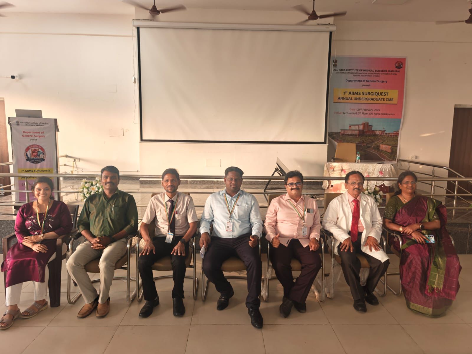 Under the guidance of President Prof (Dr) Prashant Lavania and Executive Director Prof (Dr) M Hanumantha Rao, Dept of General Surgery, AIIMS Madurai conducted the 1st AIIMS SURGIQUEST UG CME on 24/02/2026, promoting clinical reasoning and exam-oriented training