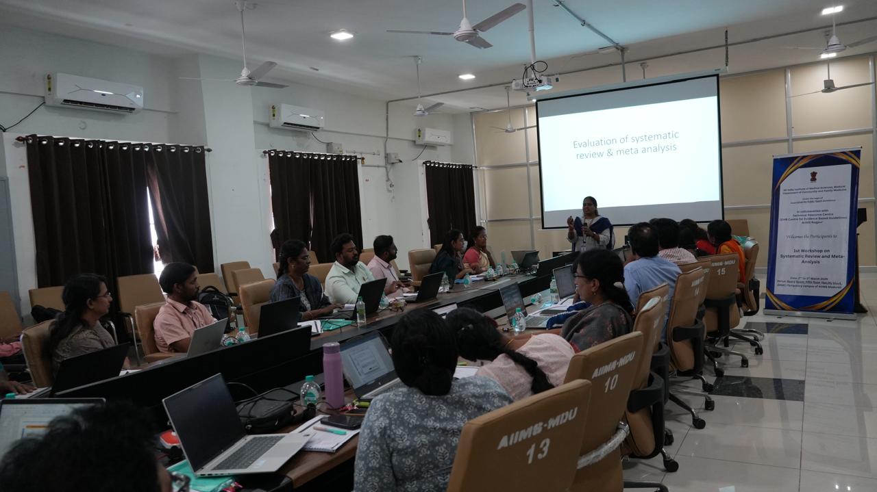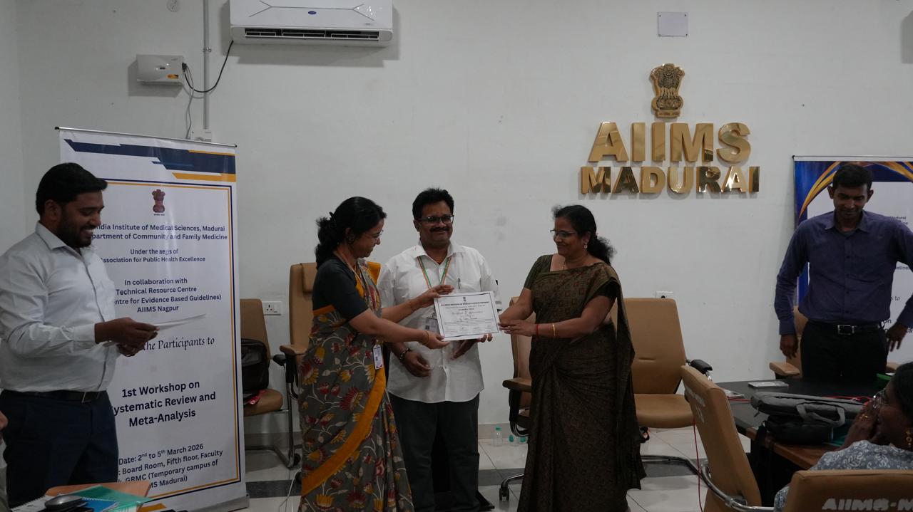 Under the guidance of honourable Executive Director Prof Dr M Hanumantha Rao, Dept of Community and Family Medicine organised the first Systematic Review and Meta-analysis workshop in collaboration with TRC of AIIMS Nagpur from 2nd March to 5th March 2026 The workshop witnessed the active participation of enthusiastic faculty members and senior residents from AIIMS Madurai They engaged in interactive discussions and hands-on learning throughout the sessions