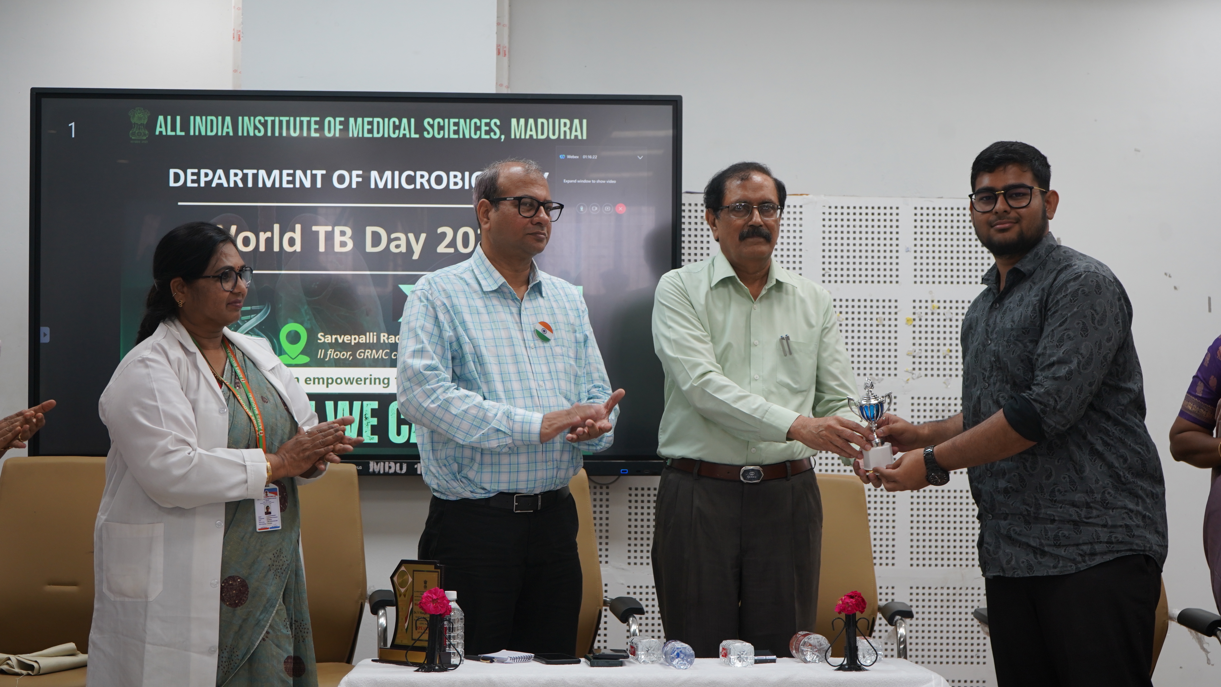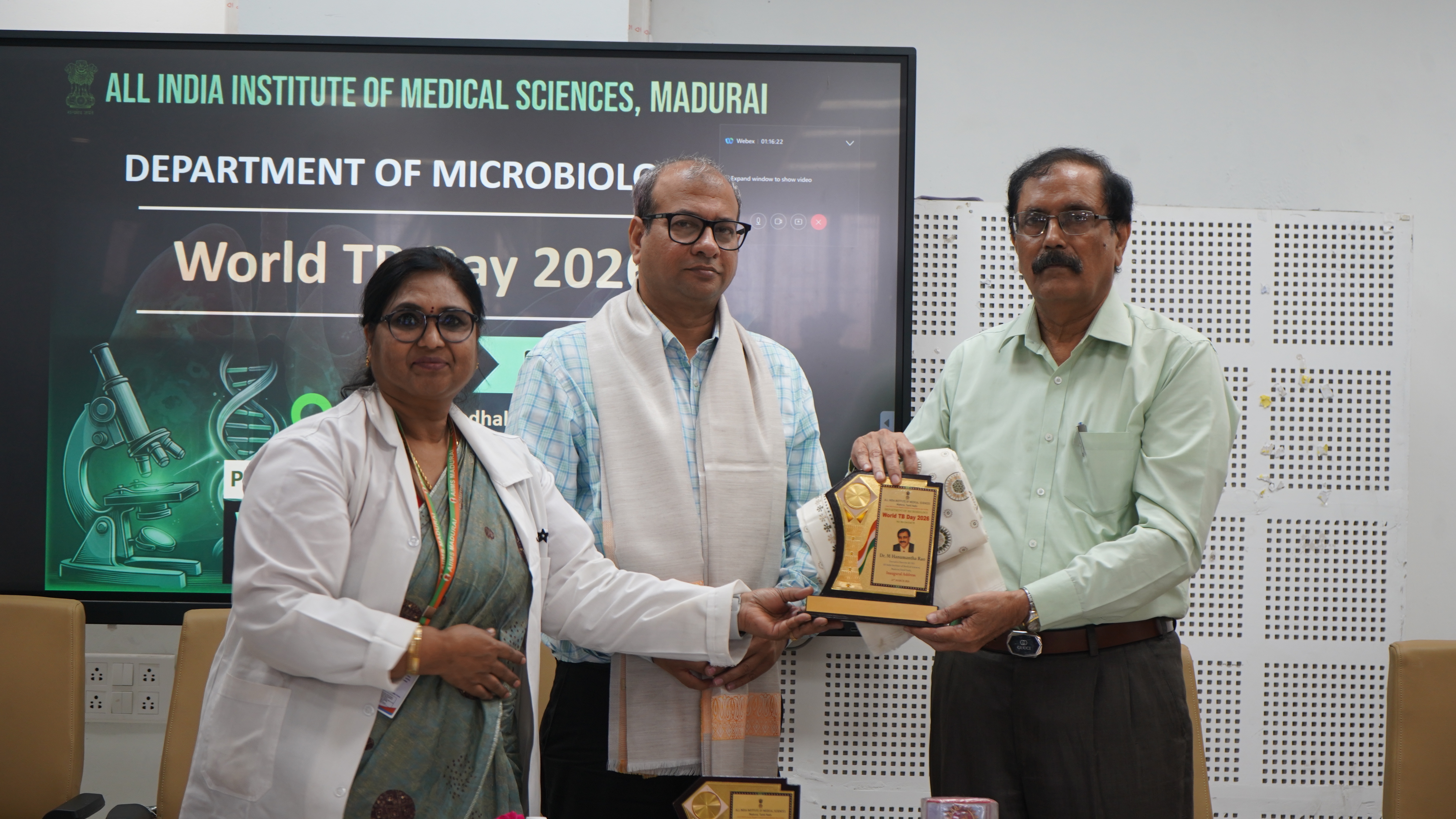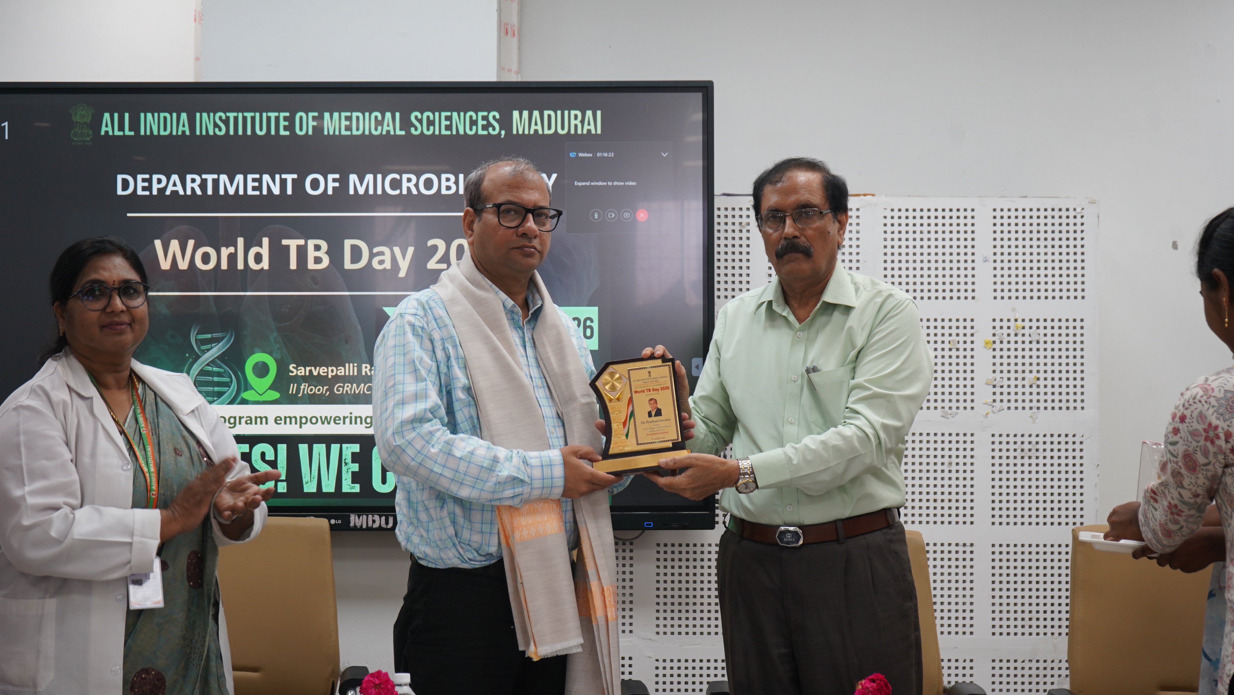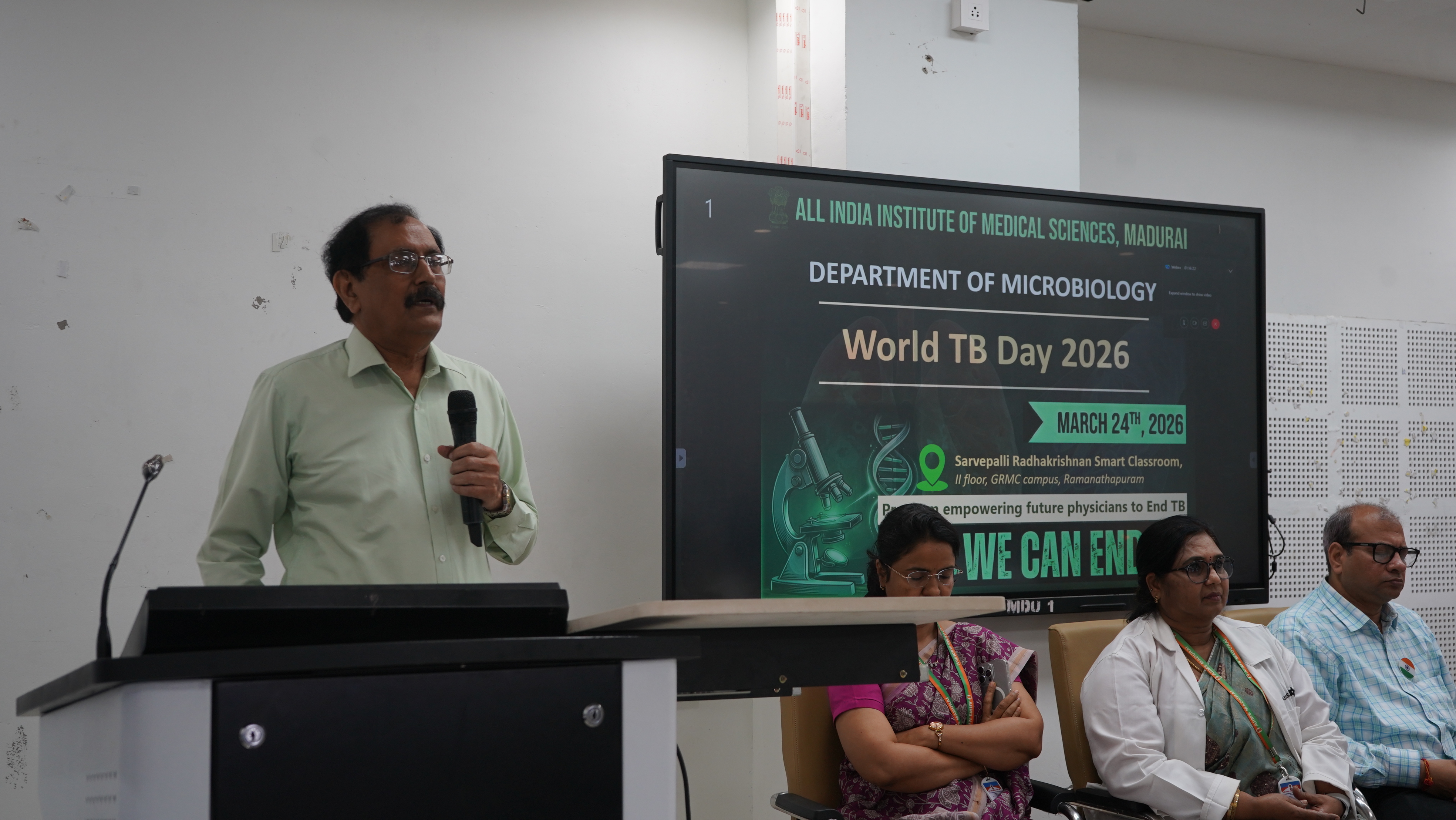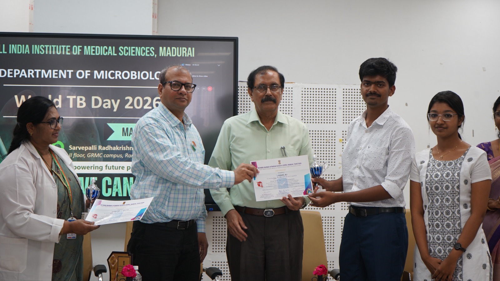 Dept of Microbiology, AIIMS Madurai organized World TB Day 2026 program. Prof (Dr) Prashant Lavania (President), Prof (Dr) M Hanumantha Rao (Executive Director) & Dr Subitha B (Vice Principal, GMC Ramanathapuram) graced the inauguration A TB-themed quiz for II MBBS (2024 batch) was conducted by Dept of Microbiology, AIIMS Madurai Prelims on 18 Mar & finals on 24 Mar 2026 Students participated enthusiastically. Top 2 teams won prizes; spot quiz winners received medals Dr Mangayarkarasi V (Prof & HOD, Microbiology) delivered a lecture on “Advanced Diagnostic Methods in TB” Dr P Chitra Rajalakshmi (Prof & HOD, SRM Trichy) spoke on “TB Control & Elimination: National & Global Outlook” Microbiology faculty were appreciated.