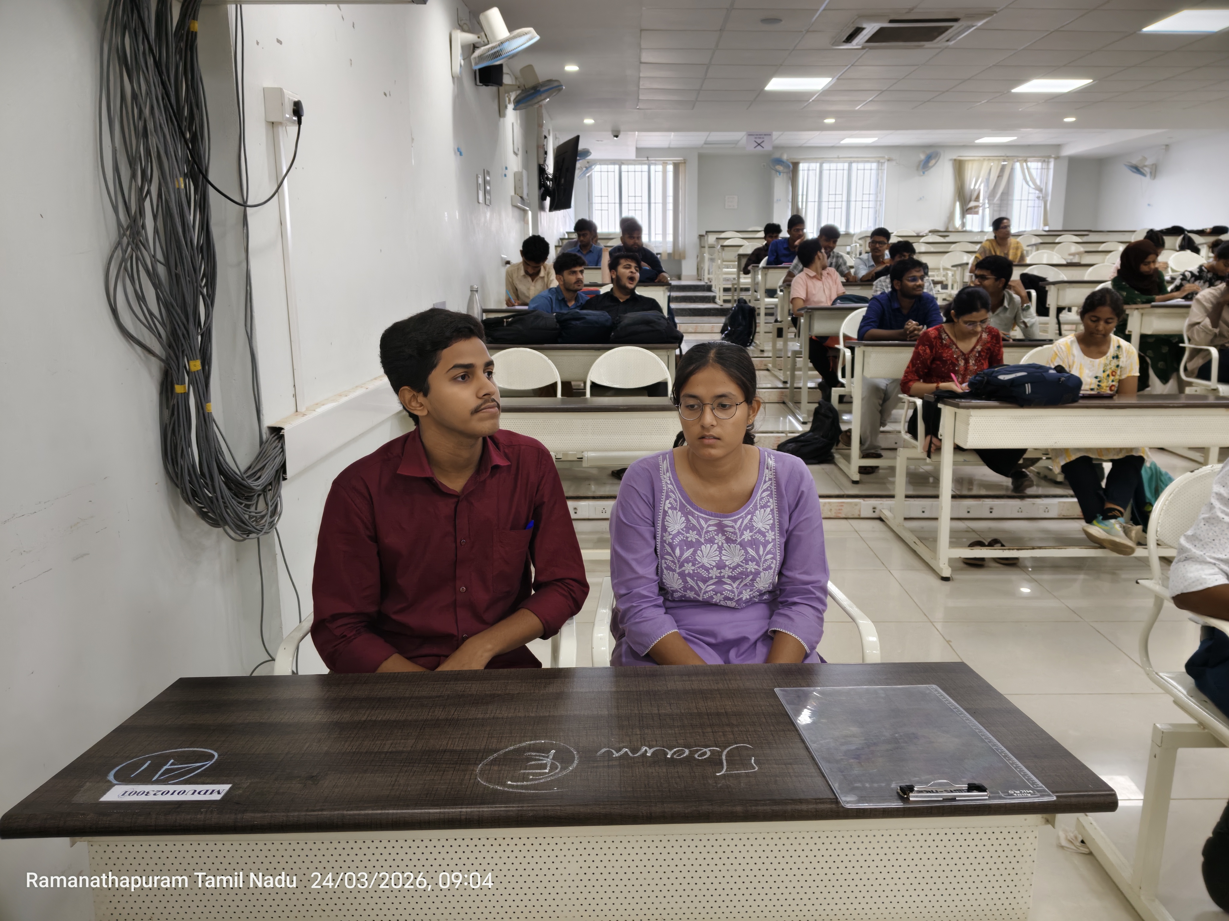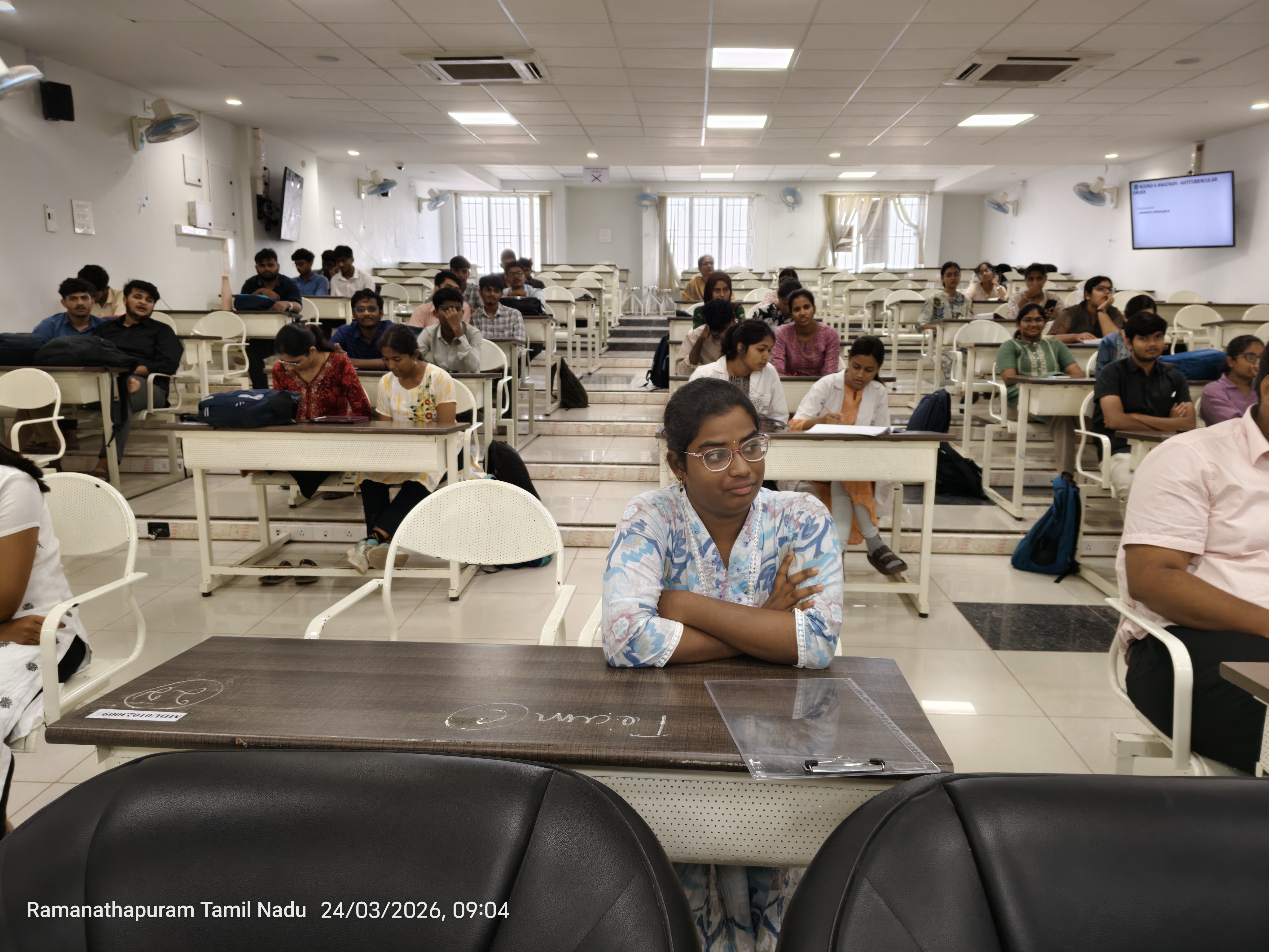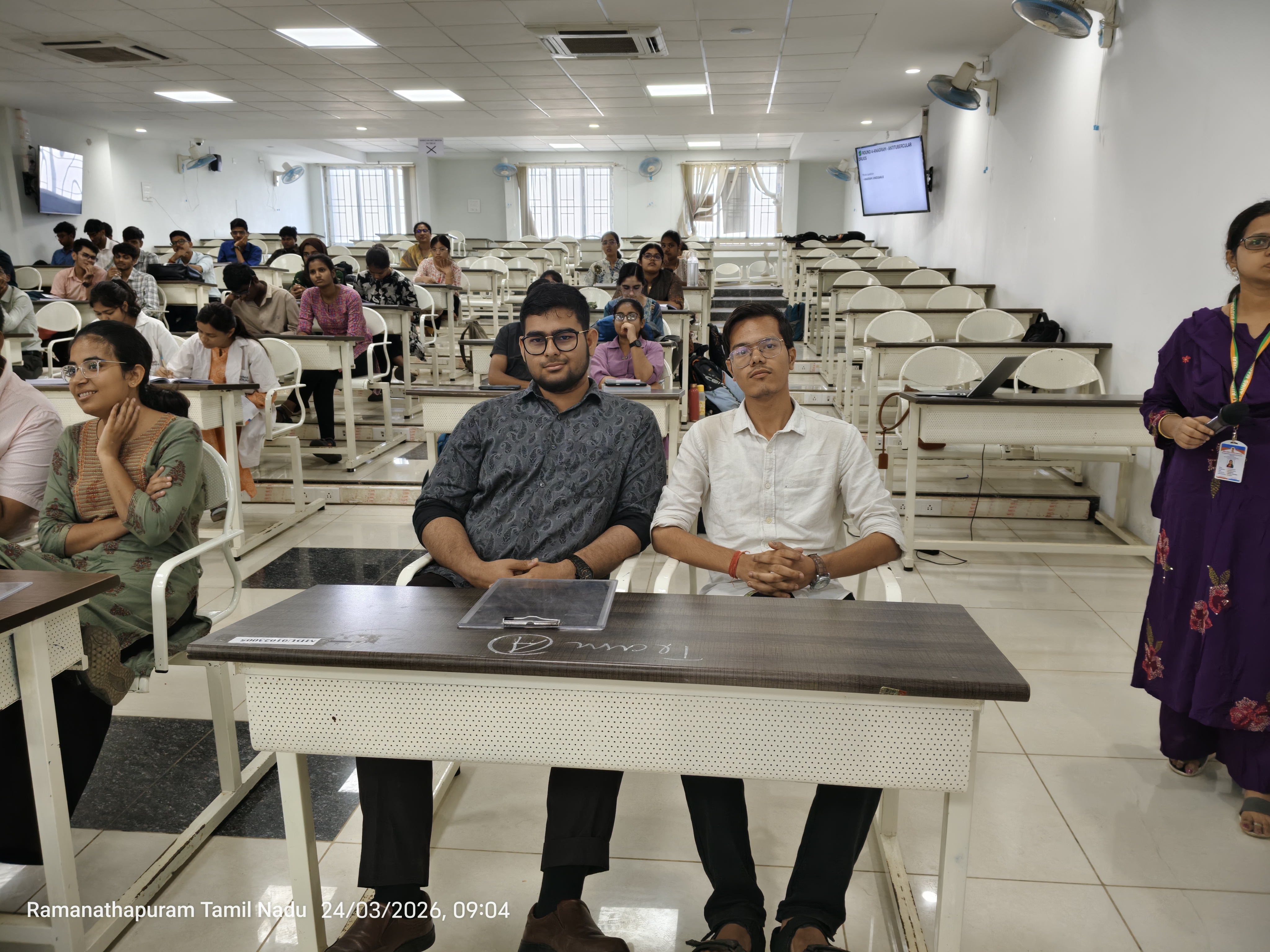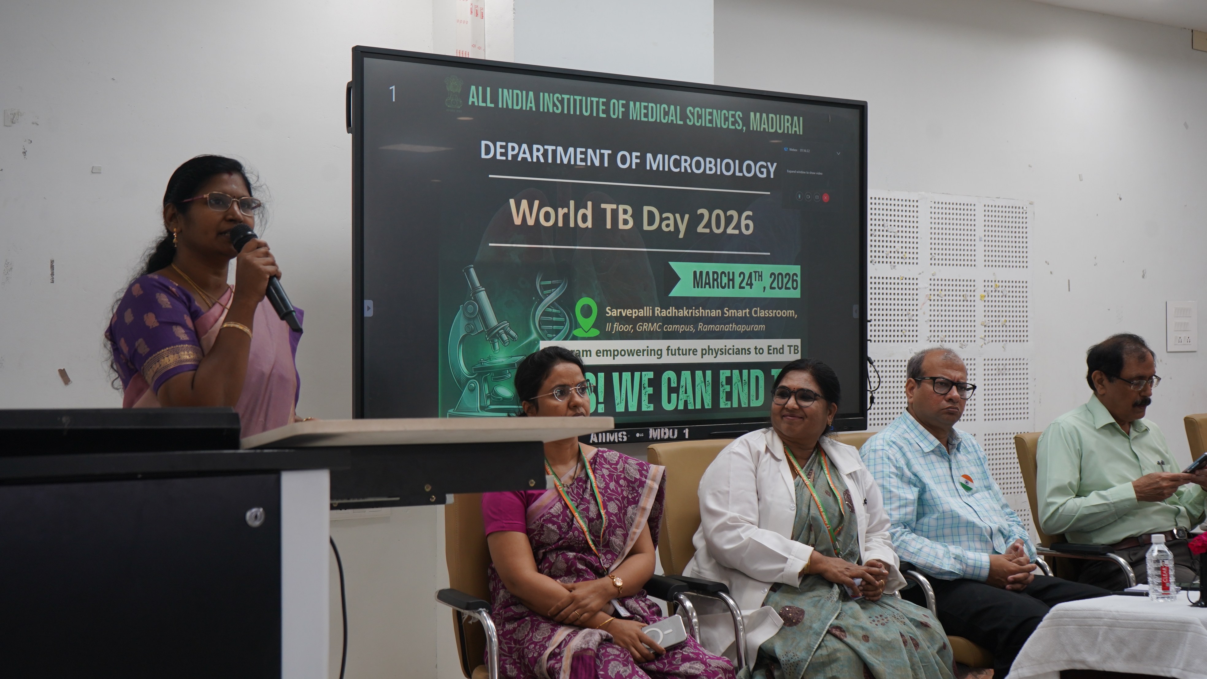 Under the guidance of the Honourable Executive Director, Prof Dr Hanumantha Rao, an awareness programme was organized on the occasion of World TB Day 2026 on 24th March 2026 at the Government Nursing College, Ramanathapuram The programme was conducted by the District TB Unit, Ramanathapuram, in collaboration with the Department of Community and Family Medicine, AIIMS Madurai, under the theme “Yes! We Can End TB: Led by Countries, Powered by People” The event was graced by the presence of distinguished faculty members, including Dr Ramesh Babu, Deputy Director (TB), District TB Unit; Dr Venkateswaran, Head of the Department of Pulmonary Medicine, Government Ramanathapuram Medical College; and Dr Praveena Daya A, Assistant Professor, Department of Community and Family Medicine, AIIMS Madurai, along with the Senior Treatment Supervisor (STS) staffs from the District TB Unit Dr Ramesh Babu delivered a talk highlighting the theme of World TB Day and emphasized the importance of tuberculosis elimination Dr Venkateswaran elaborated on the risk factors, symptoms, diagnosis, management, and counselling aspects of tuberculosis Dr Praveena Daya A spoke on the vital role of nursing staff in TB elimination, stressing prevention through community awareness at the primary healthcare level and the importance of infection control practices in hospital settings to prevent the spread of TB The programme concluded with a pledge taken by all students and staff in line with the World TB Day theme The vote of thanks was delivered by the Principal of the Government Nursing College, marking the successful completion of the event